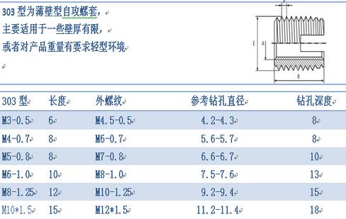 薄壁型绍兴自攻螺套外观上看主要有两种区分,一种是一端开槽型的,另一种是一端三圆孔型的,其中开圆孔型的又分为307型和308型两种,307型和308型外观主要区别就是同一直径下,长度和外径大小有所区分。以上各种型式螺套均具有自行攻牙功能。